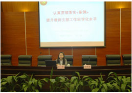 4月8日上午,培训班继续进行。教卫党委组织处方涛同志作“认真贯彻落实《条例》,提升教师支部工作科学化水平”的辅导报告。随后,李世平副书记主持党建工作学习交流。学生工作部、体育部直属支部、外国语学院总支、思想政治理论教学部直属支部分别交流了他们在学风建设、师生结对案例、师德师风和班风学风建设和探索思想政治理论教育的新途径等方面贯彻《条例》落实《规划》的学习体会,并且进行了现场提问应答的互动。