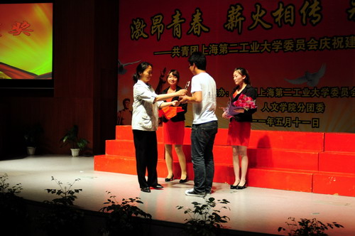 刚刚在上海市高校红歌比赛荣获铜奖的我校“青檬”女生合唱团表演了他们的参赛曲目——《打起手鼓唱起歌》,将红歌大赛的气氛推向了高潮。最后,电子学院以其独特的表演形式和洪亮的歌声征服了场上所有评委,荣获一等奖。外国语学院和人文学院以其专业和优美的歌声荣获二等奖,计算机学院、机电学院和艺术学院荣获三等奖;国际交流学院、环境学院、理学院、经济管理学院荣获优胜奖。