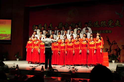 火红的五月,激昂的青春。为了庆祝建党90周年,激发我校大学生爱党爱国热情,展现校园青春风采,我校大学生喜迎建党90周年红歌大赛于5月11日晚在图文信息中心四百人报告厅隆重举行,同学们用歌声表达了青年学子对党的赞美和热爱。