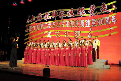 我校教工合唱团参加上海市教育工会于5月13日在上海财经大学举行的东北片高校“上海教师永远跟党走——庆祝建党90周年文艺汇演”,高歌一曲“大中国”,赢得了全场热烈掌声,校工会荣获优秀组织奖。排练期间,党委书记阮显忠亲临现场为大家加油鼓劲。