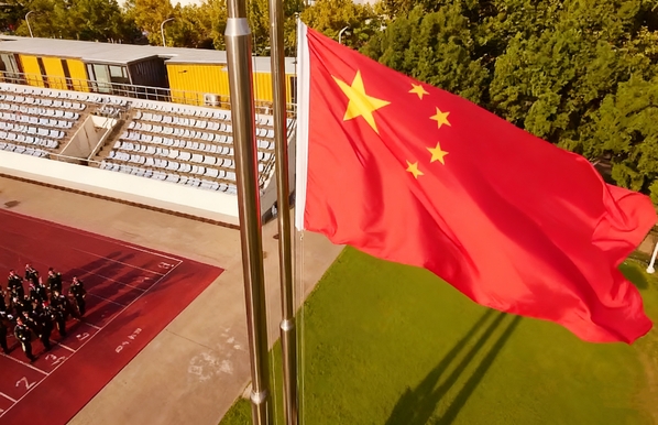 高歌以寄赤子情,追光逐梦启新程。《我和我的祖国》歌声响起,伴随歌声,现场同学们托举五星红旗穿越方阵,同学们通力合作、默契配合,同时展开“勤奋、自强、求实、创新”的校风标语,与巨幅国旗交相辉映,成为现场最动人的风景。