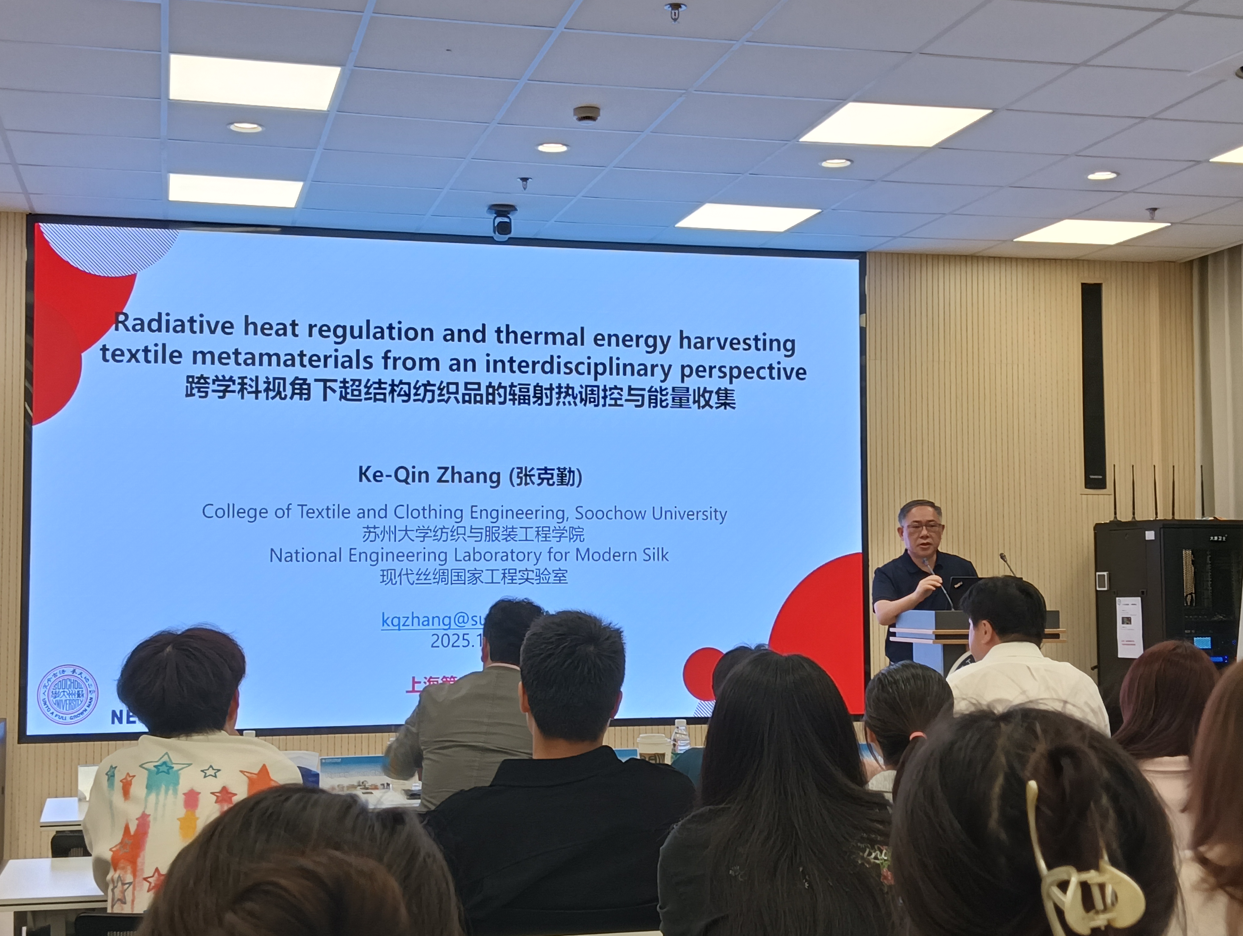 苏州大学纺织与服装工程学院院长张克勤教授带来了题为“跨学科视角下超结构纺织品的辐射热调控与能量收集”的报告,详细介绍了超结构纳米纤维纺织品作为热电功能材料的重要应用。