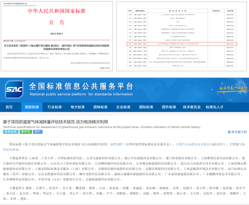 近日,国家市场监督管理总局、国家标准化管理委员会发布中华人民共和国国家标准公告(2025年第29号),由我校牵头制定的《基于项目的温室气体减排量评估技术规范动力电池梯次利用》(GB/T 46565-2025)正式获批发布。这是我国“双碳”领域首个聚焦动力电池梯次利用的国家标准,标志着动力电池梯次利用在温室气体减排量评估领域实现了从“经验判断”到“标准量化”的关键跨越。