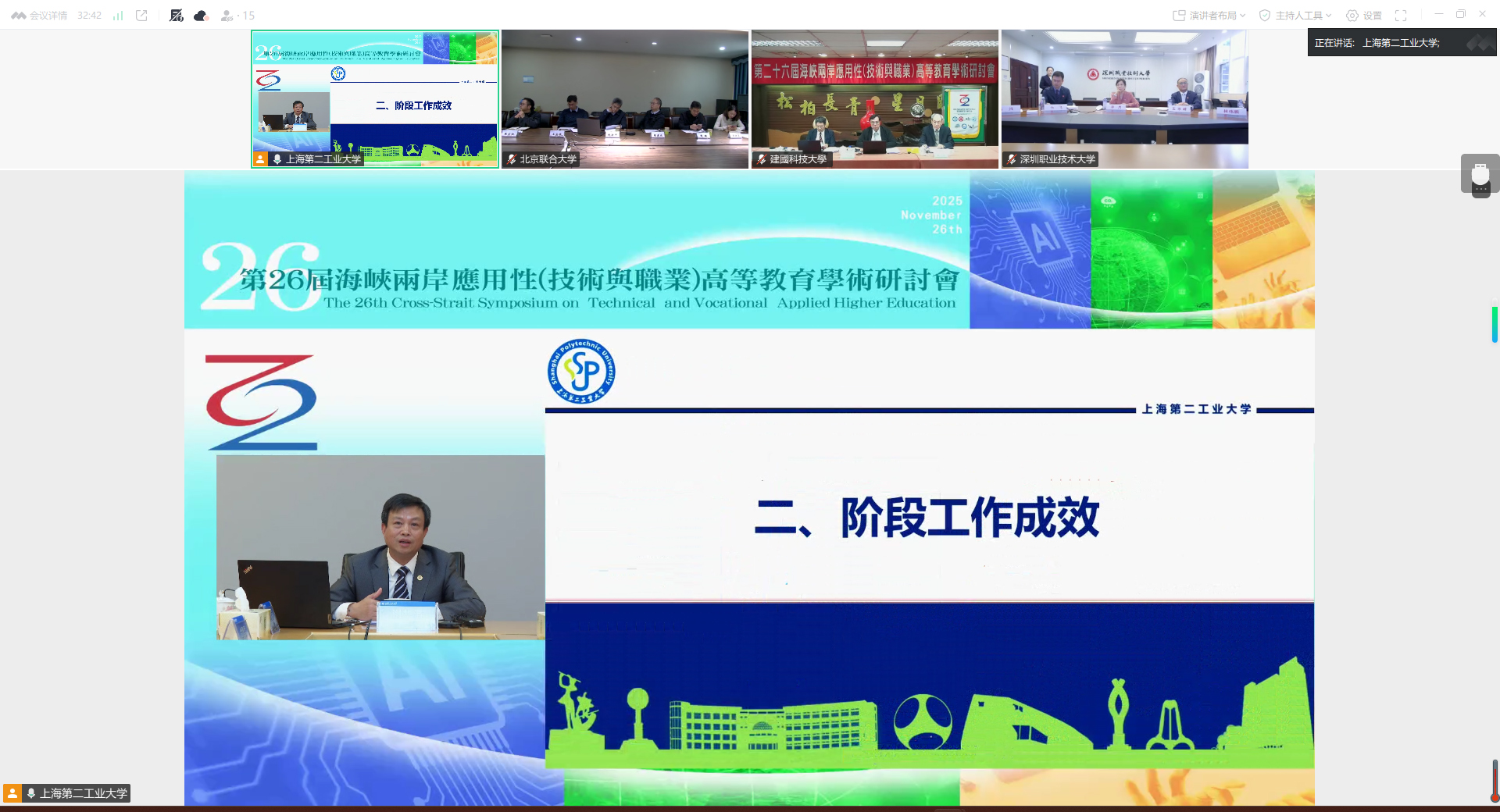 11月17日,第26届海峡两岸应用性(技术与职业)高等教育学术研讨会在线举行。本次会议由建国科技大学承办,上海第二工业大学、北京联合大学、深圳职业技术大学、龙华科技大学、朝阳科技大学等两岸发起单位及合作单位的校领导和代表出席会议。会议主题为“AI + 永续,开创技职教育与产业发展的新思维”,来自海峡两岸的校长、专家围绕这一主题展开了广泛而深入地研讨。我校校长谢华清,校长办公室、发展规划处(高等教育研究所)、教务处(教师教学发展中心)、学生工作部、港澳台办公室等相关负责人参加了会议。