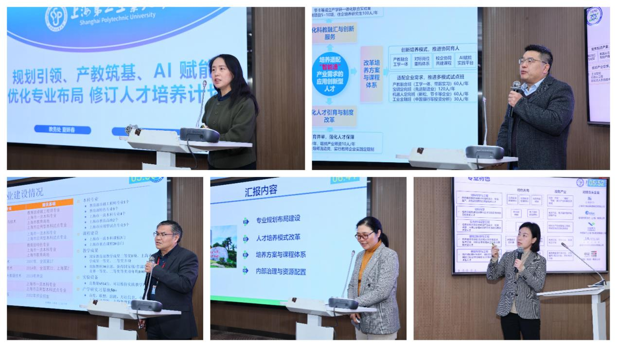 在汇报环节,各学院分别展示了改革举措与成果以及未来规划。智能制造与控制工程学院拟新增机器人工程等3个专业,并试点“工学交替”培养模式;计算机与信息工程学院拟增设人工智能专业及开设了“大模型应用技术”微专业,实现了毕业设计100%源自企业课题;资源与环境工程学院聚焦绿色低碳,构建了“5+1+7+2+2”专业集群;能源与材料学院深化了与龙头企业的专项班合作,构建了“产业链导向培养闭环”;集成电路学院则定位集成电路装备与封测领域,强化实践教学及深化产学研合作,构建梯次培养体系。数理与统计学院服务集成电路等战略产业,重构人才培养模式;经济与管理学院坚持“管工融合”,开设微专业,推进“专业+标准化”融合试点;语言与文化传播学院培养“通世界、懂工业、会传播”的人才;艺术与设计学院推动“产业+设计”教育体系,探索工科与美学的融合。