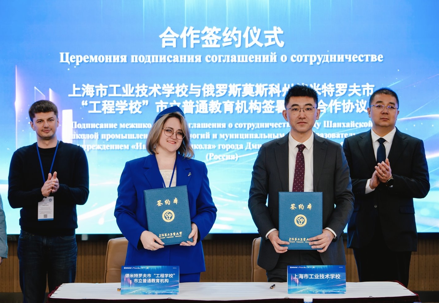 开营仪式上,我校校长谢华清与莫斯科国立人文技术大学校长加林娜·尼古拉耶芙娜·斯库达列娃共同签署两校校际科教合作协议;上海市工业技术学校校长张伟罡与“德米特罗夫市工程学校”公立教育机构校长布拉日尼科娃·娜塔莉亚·彼得罗夫娜共同签署校际合作框架协议。我校副校长白建峰、莫斯科州教育部普通教育发展司副司长叶莲娜·日丹金娜、上海市工业技术学校党委书记李琦明、莫斯科州德米特罗夫市级区行政管理教育局局长塔季扬娜·马林尼科娃先后见证签约。