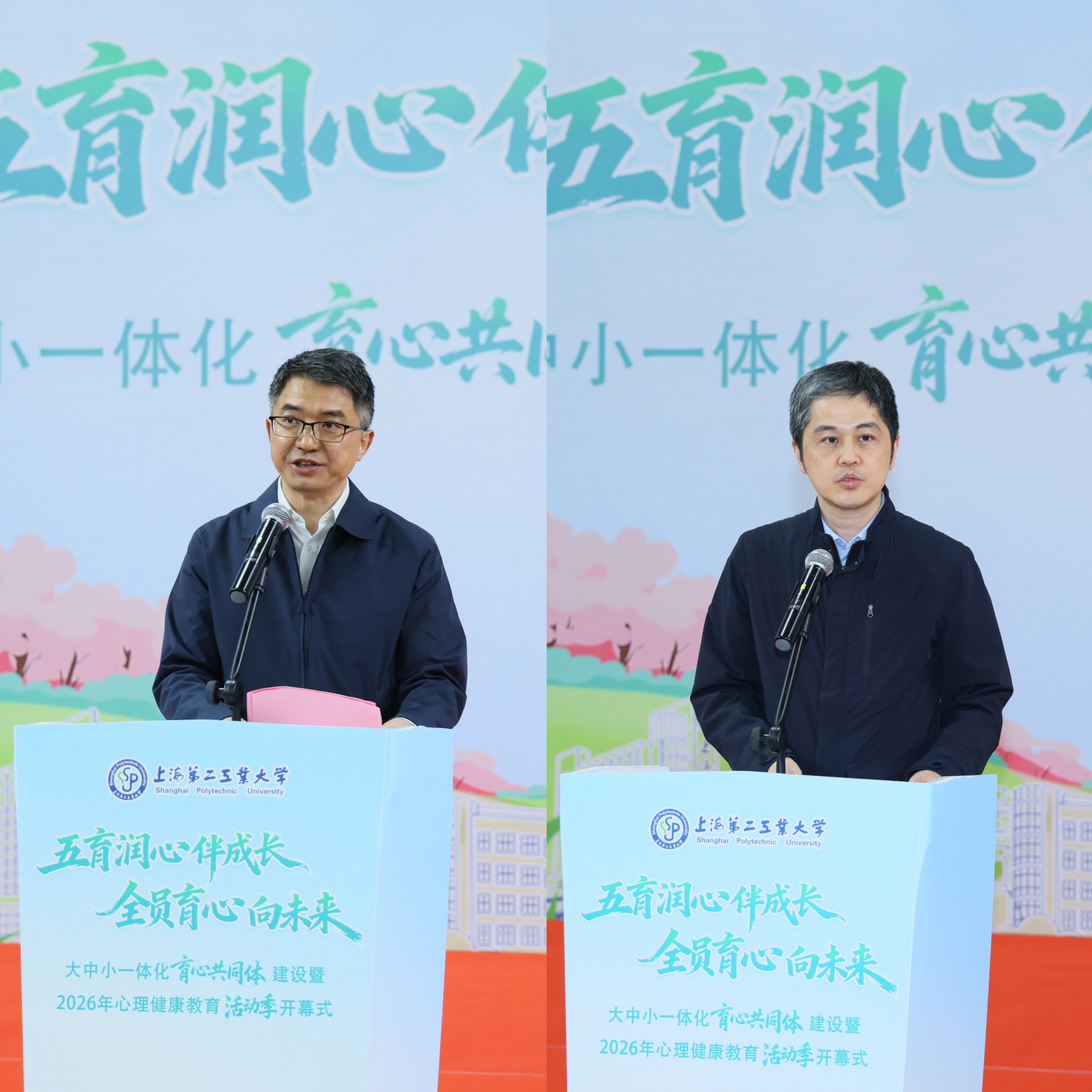 4月23日中午,学校大中小学一体化育心共同体建设暨2026年心理健康活动季开幕式在体育馆内举行。上海市教委德育处、上海市教育科学研究院德育发展研究院、杨浦区精神卫生中心、浦东新区精神卫生中心、上海市工业技术学校、上海市经济管理学校、上海市第二轻工业学校、附属龚路中学等单位领导,学校相关职能部门负责人、各学院分管学院副书记、教师代表、全体辅导员、学生代表等齐聚现场,共同参加本次活动。