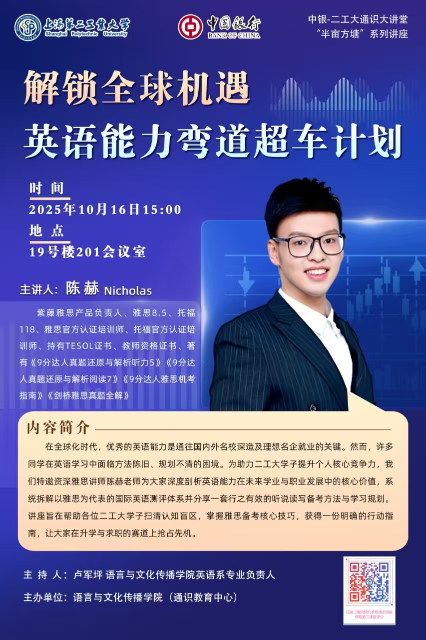 在全球化时代,优秀的英语能力是通往国内外名校深造及理想名企就业的关键。然而,许多同学在英语学习中面临方法陈旧、规划不清的困境。为助力二工大学子提升个人核心竞争力,我们特邀资深雅思讲师陈赫老师为大家深度剖析英语能力在未来学业与职业发展中的核心价值,系统拆解以雅思为代表的国际英语测评体系并分享一套行之有效的听说读写备考方法与学习规划。讲座旨在帮助各位二工大学子扫清认知盲区,掌握雅思备考核心技巧,获得一份明确的行动指南,让大家在升学与求职的赛道上抢占先机。