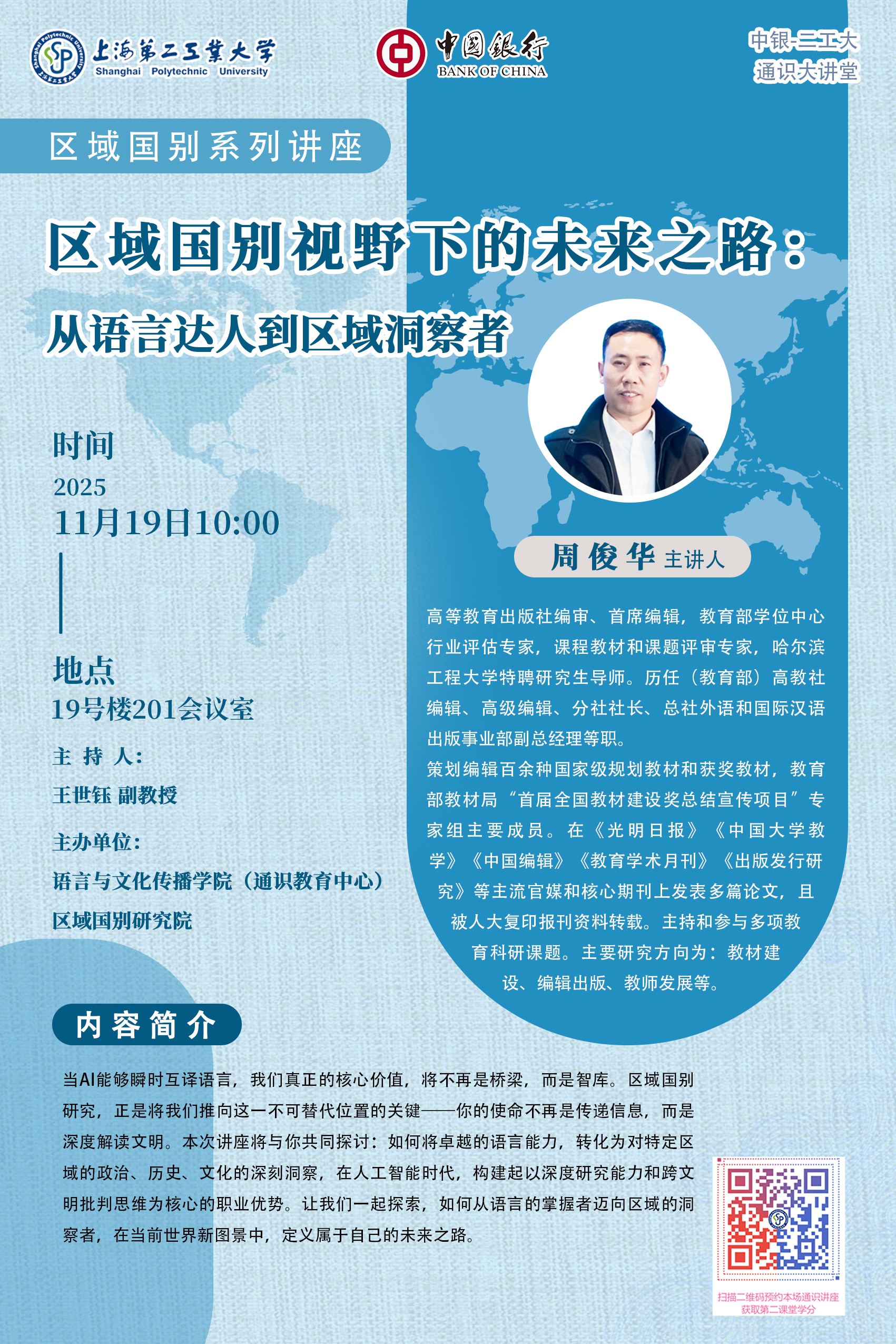当AI能够瞬时互译语言,我们真正的核心价值,将不再是桥梁,而是智库。区域国别研究,正是将我们推向这一不可替代位置的关键――你的使命不再是传递信息,而是深度解读文明。本次讲座将与你共同探讨:如何将卓越的语言能力,转化为对特定区域的政治、历史、文化的深刻洞察,在人工智能时代,构建起以深度研究能力和跨文明批判思维为核心的职业优势。让我们一起探索,如何从语言的掌握者迈向区域的洞察者,在当前世界的新图景中,定义属于自己的未来之路。