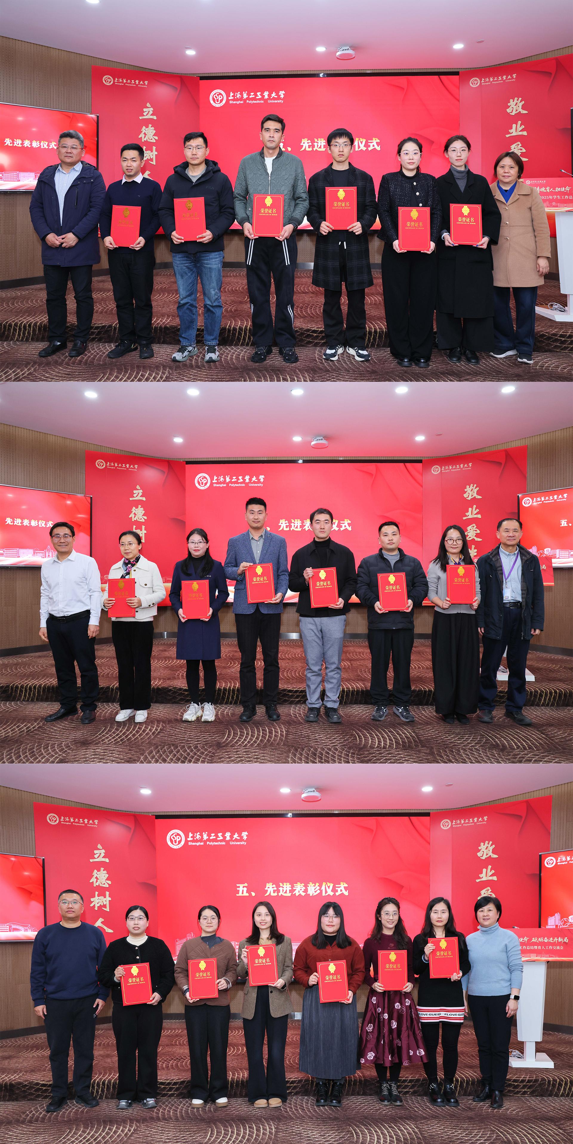 党委组织部部长杨顺莉、党委宣传部部长殷革兰为获集体奖项代表颁奖;研究生处处长赵景波、招生就业处处长经晓峰为理论研究类获奖代表颁奖;后勤服务中心党总支书记陈敏俐、保卫处处长黄晓峰为育人实践类获奖代表颁奖。