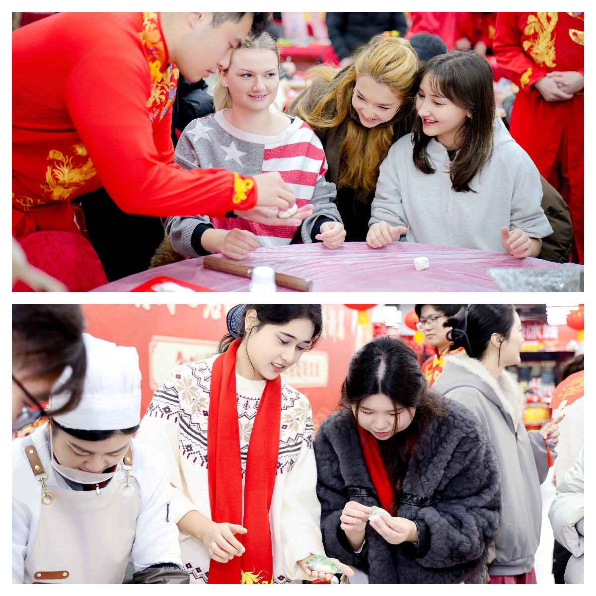 中外学子围坐一起,揉面擀皮、调馅捏饺,其乐融融。来自哈萨克斯坦的留学生Vinshel Viktoriya第一次尝试包出“元宝饺”,直呼这是“最有趣的中国年体验”。