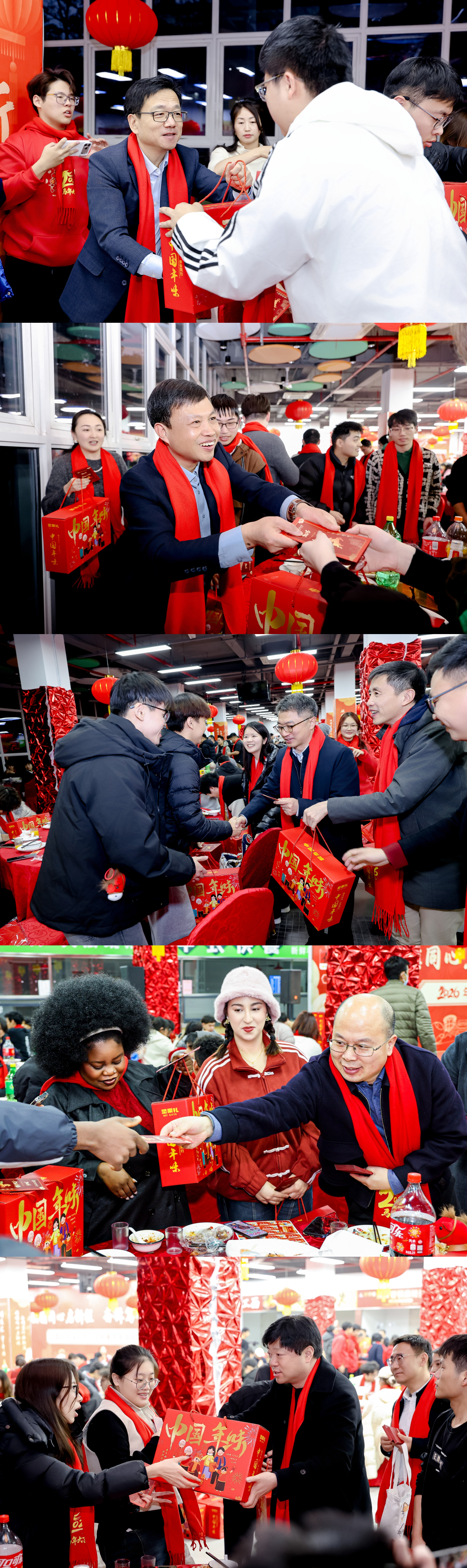 与会领导深入各餐桌,为同学们送上新年礼包与压岁红包,关切询问学习生活情况,叮嘱注意安全、安心过年。