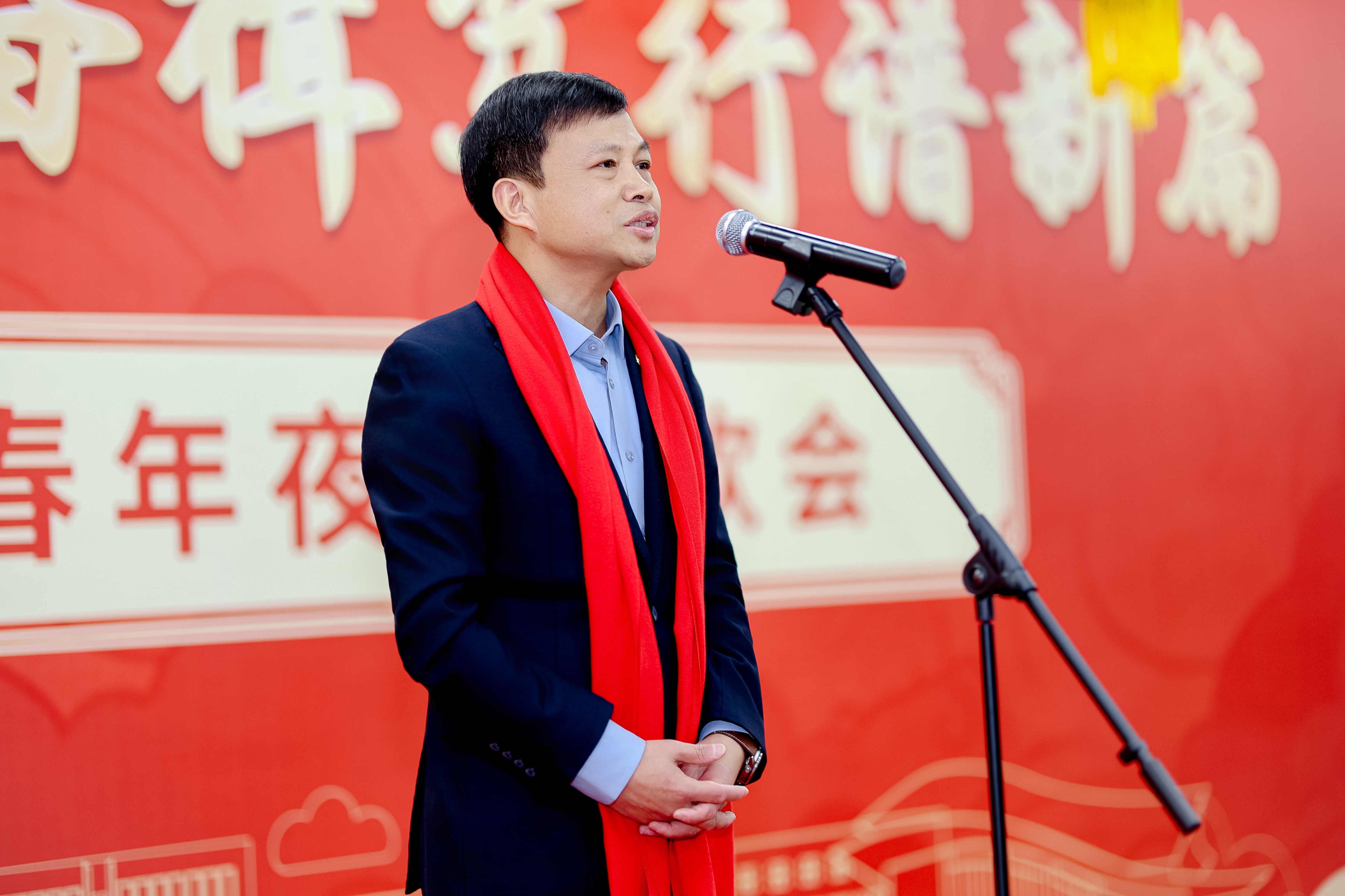 谢华清发表热情洋溢的新春致辞。他表示,2025年学校以“重服务强贡献”为导向,全力推进高等教育综合改革,在学科建设、产教融合、育人成果等方面取得显著进展。机构改革活力不断释放,科研实力显著增强,科研项目、奖项与经费创历史新高。服务保障持续优化,校园建设与文化品牌不断深化,育人成果显著,重大赛事取得突破。2026年,学校将乘风破浪、再谱新篇。他勉励同学们珍惜时光、脚踏实地、勇于探索,将个人成长融入国家发展,与时代同频共振,并祝愿大家新春愉快。