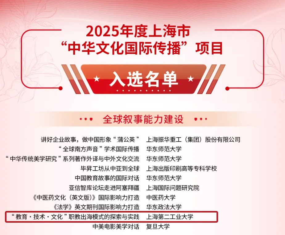 近日,2025年度上海市“中华文化国际传播”和“银鸽之光”征集活动评选结果揭晓,我校申报的《“教育・技术・文化”职教出海模式的探索与实践》成功入选2025年度上海市“中华文化国际传播”项目(全球叙事能力建设),这也是我校首次获此殊荣,标志着学校在中华文化国际传播领域取得重要突破。