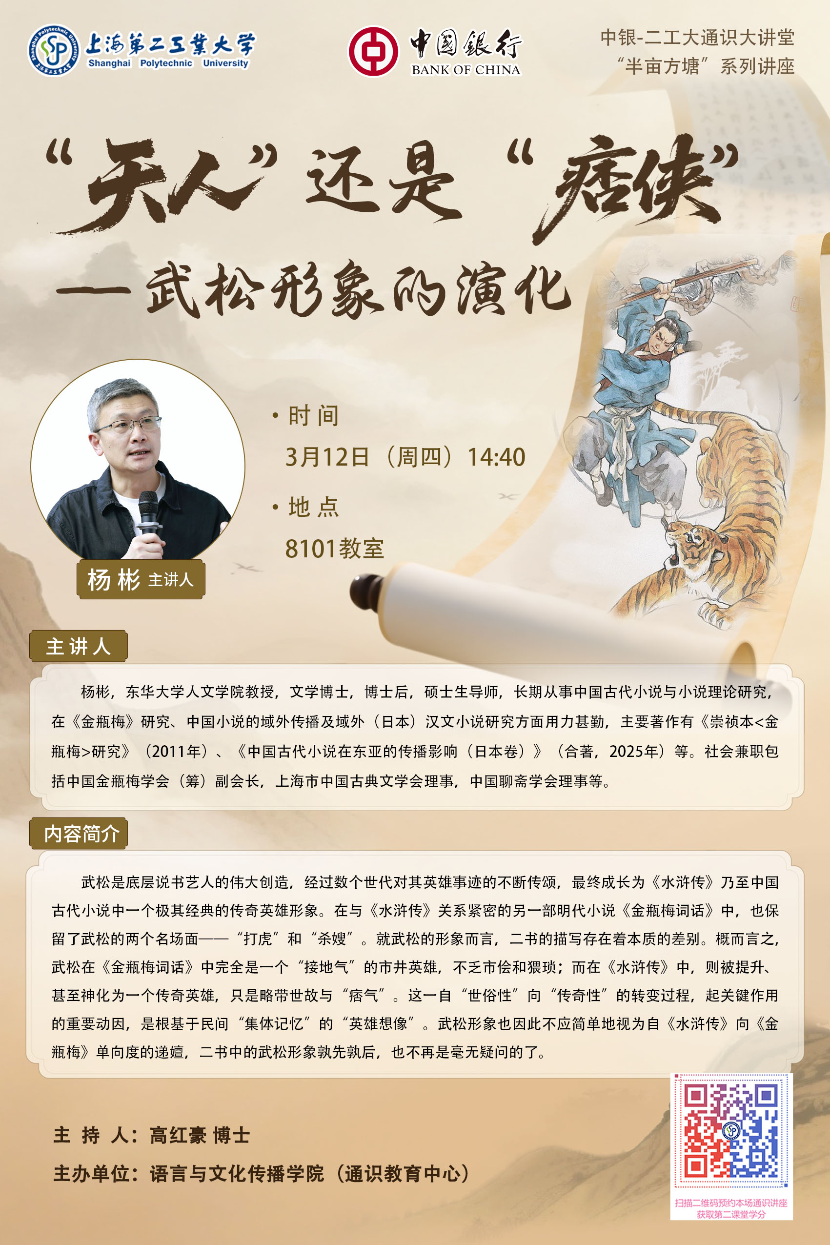 杨彬,东华大学人文学院教授,文学博士、博士后,硕士生导师,长期从事中国古代小说与小说理论研究,在《金瓶梅》研究、中国小说的域外传播及域外(日本)汉文小说研究方面用力甚勤,主要著作有《崇祯本<金瓶梅>研究》(2011年)《中国古代小说在东亚的传播影响(日本卷)》(合著,2025年)等。社会兼职包括中国金瓶梅学会(筹)副会长,上海市中国古典文学会理事,中国聊斋学会理事等。