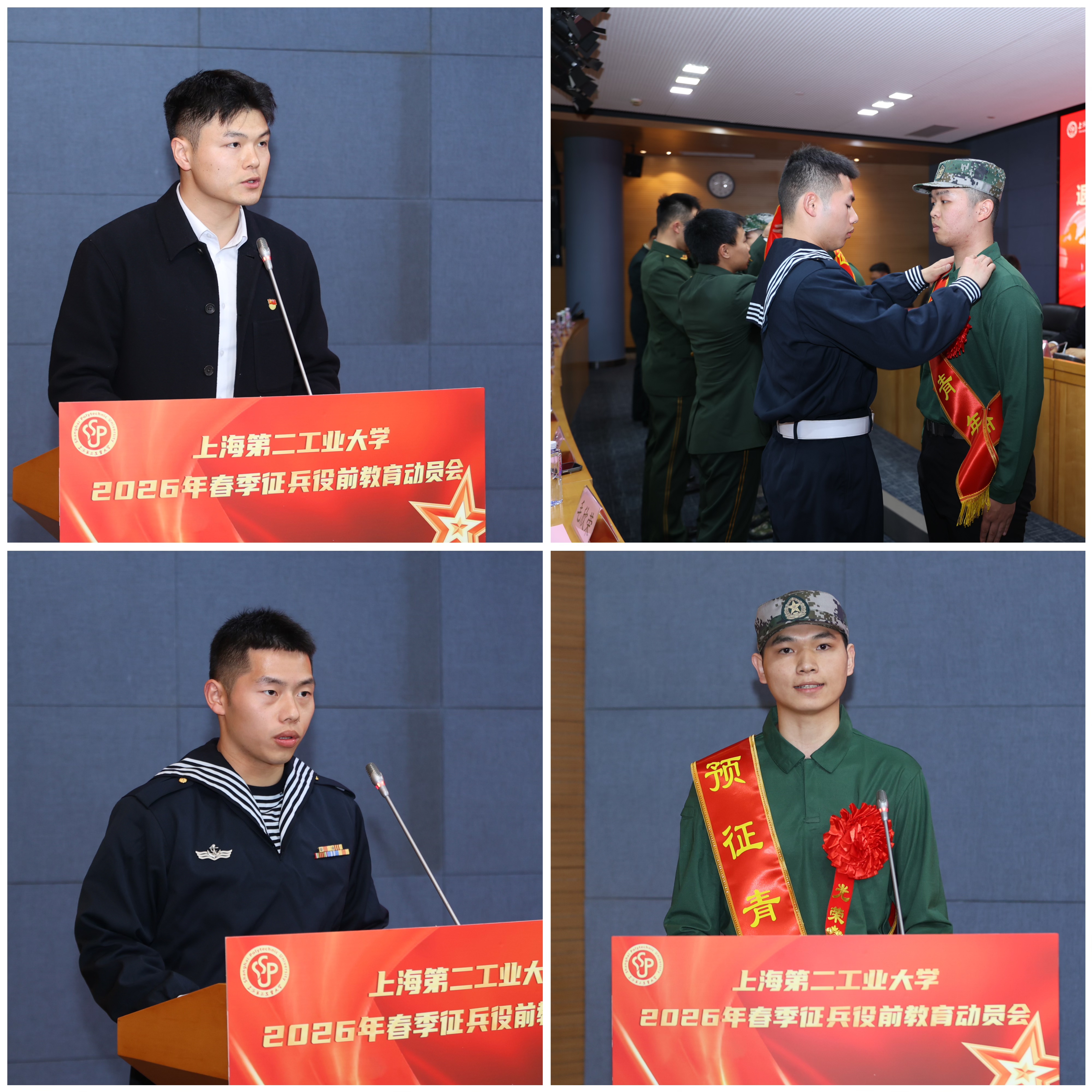 会上,资源与环境工程学院周忠洋代表“双合格”预征学生发言,他表示将以饱满热情投入役前教育。退役大学生士兵代表、数理与统计学院邵鸿飞鼓励预征青年尽快转变心态,在军营淬炼成钢。辅导员代表、智能制造与控制工程学院龚旖德老师号召大家在部队尽快成长为“有理想、敢担当、能吃苦、肯奋斗”的新时代青年。会上,2026年退役大学生士兵为即将参加役前教育的“双合格”预征学生代表佩戴绶带,象征着军旅荣誉的传承和强军使命的赓续,激励预征青年不忘初心,续写报国荣光。