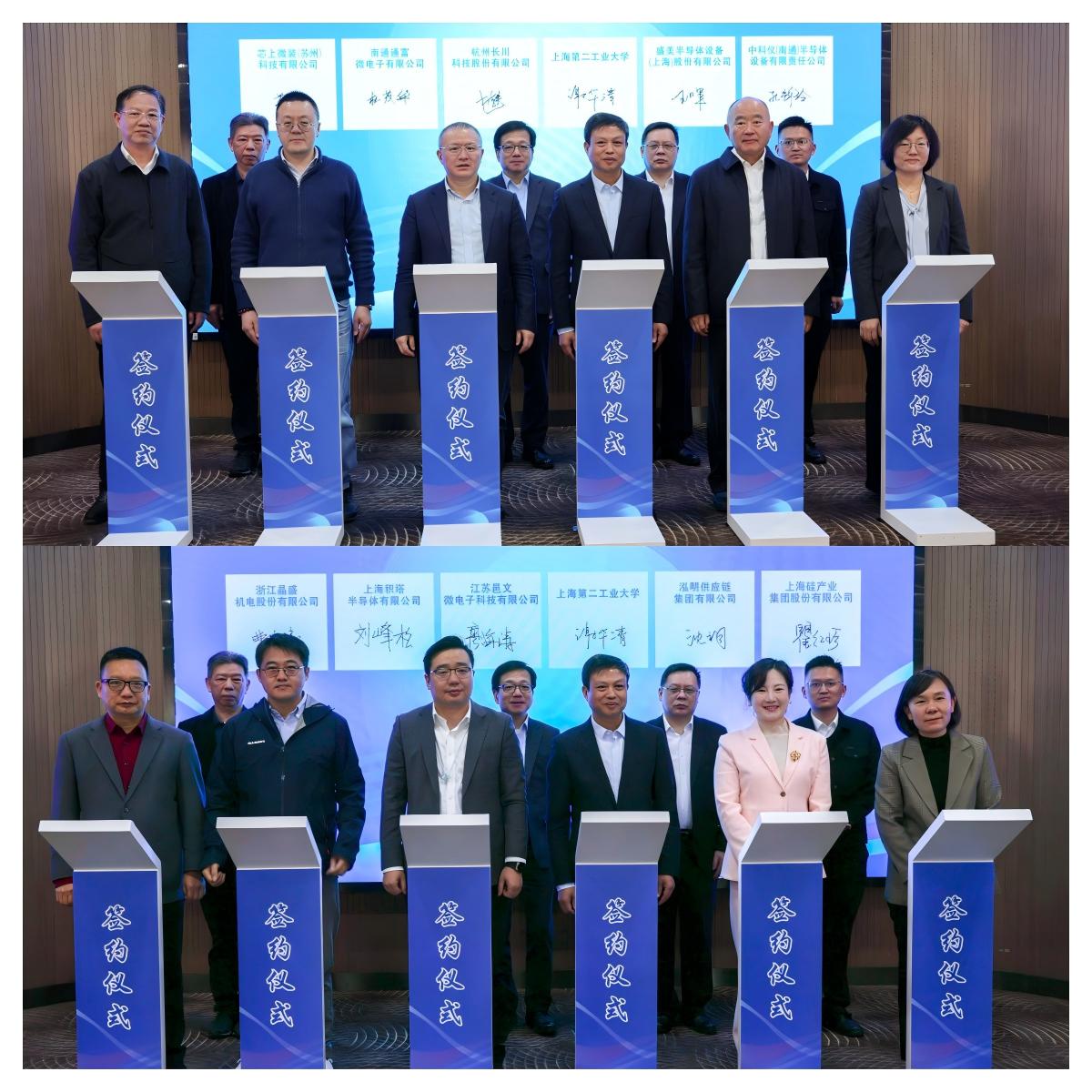 签约仪式上,谢华清校长与浙江晶盛机电股份有限公司董事长曹建伟、上海积塔半导体有限公司资深副总刘松峰、江苏邑文微电子科技有限公司董事长廖海涛、泓明供应链有限公司执行董事沈翊、上海硅产业集团股份有限公司代表瞿红珍、芯上微装科技有限公司董事长茅雁、通富微电子股份有限公司代表杜茂华、杭州长川科技股份有限公司董事长赵轶、盛美半导体设备股份有限公司董事长王晖、中科仪(南通)半导体设备有限责任公司总经理孔祥玲等十家公司的代表签署了人才培养和科研合作协议。赵震、张素心、陆敏、周乃文四位领导见证了签约仪式。