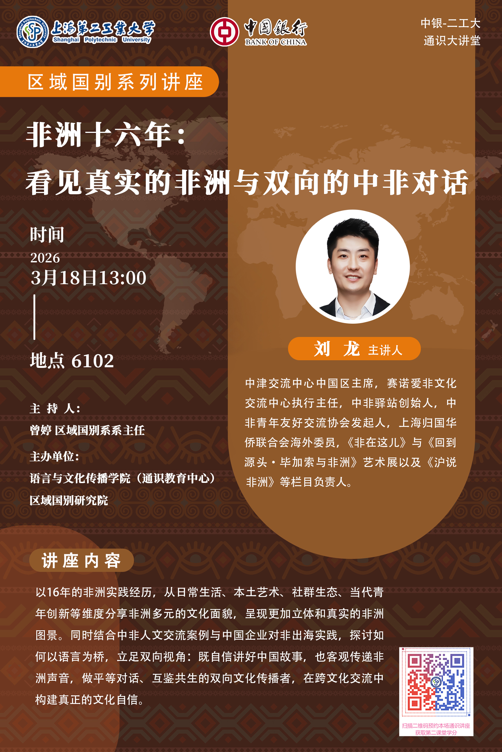 以16年的非洲实践经历,从日常生活、本土艺术、社群生态、当代青年创新等维度分享非洲多元的文化面貌,呈现更加立体和真实的非洲图景。同时结合中非人文交流案例与中国企业对非出海实践,探讨如何以语言为桥,立足双向视角:既自信讲好中国故事,也客观传递非洲声音,做平等对话、互鉴共生的双向文化传播者,在跨文化交流中构建真正的文化自信。