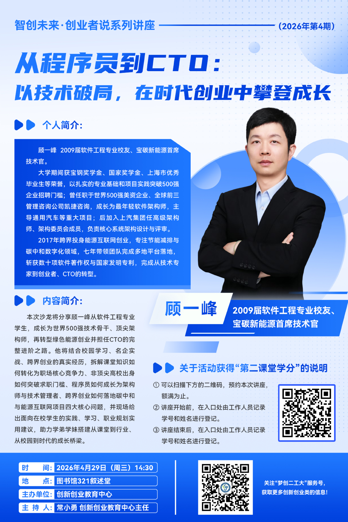 本次沙龙将分享顾一峰从软件工程专业学生,成长为世界500强技术骨干、顶尖架构师,再转型绿色能源创业并担任CTO的完整进阶之路。他将结合校园学习、名企实战、跨界创业的真实经历,拆解课堂知识如何转化为职场核心竞争力、非顶尖高校出身如何突破求职门槛、程序员如何成长为架构师与技术管理者、跨界创业如何落地碳中和与能源互联网项目四大核心问题,并现场给出面向在校学生的实践、学习、职业规划实用建议,助力学弟学妹搭建从课堂到行业、从校园到时代的成长桥梁。