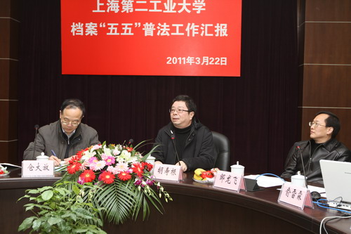 2011年3月22日,上海市档案局、市教委对我校档案“五五”普法工作情况进行了检查验收。检查验收组成员由上海市档案局正局级巡视员仓大放、政策法规处处长杨红、业务指导处处长赵嘉庆等组成,上海市教委办公室副主任许波等共同参与现场验收。我校校长胡寿根、副校长邹龙飞及校档案工作委员会成员、专兼职档案人员参加了会议。会议由邹副校长主持。
