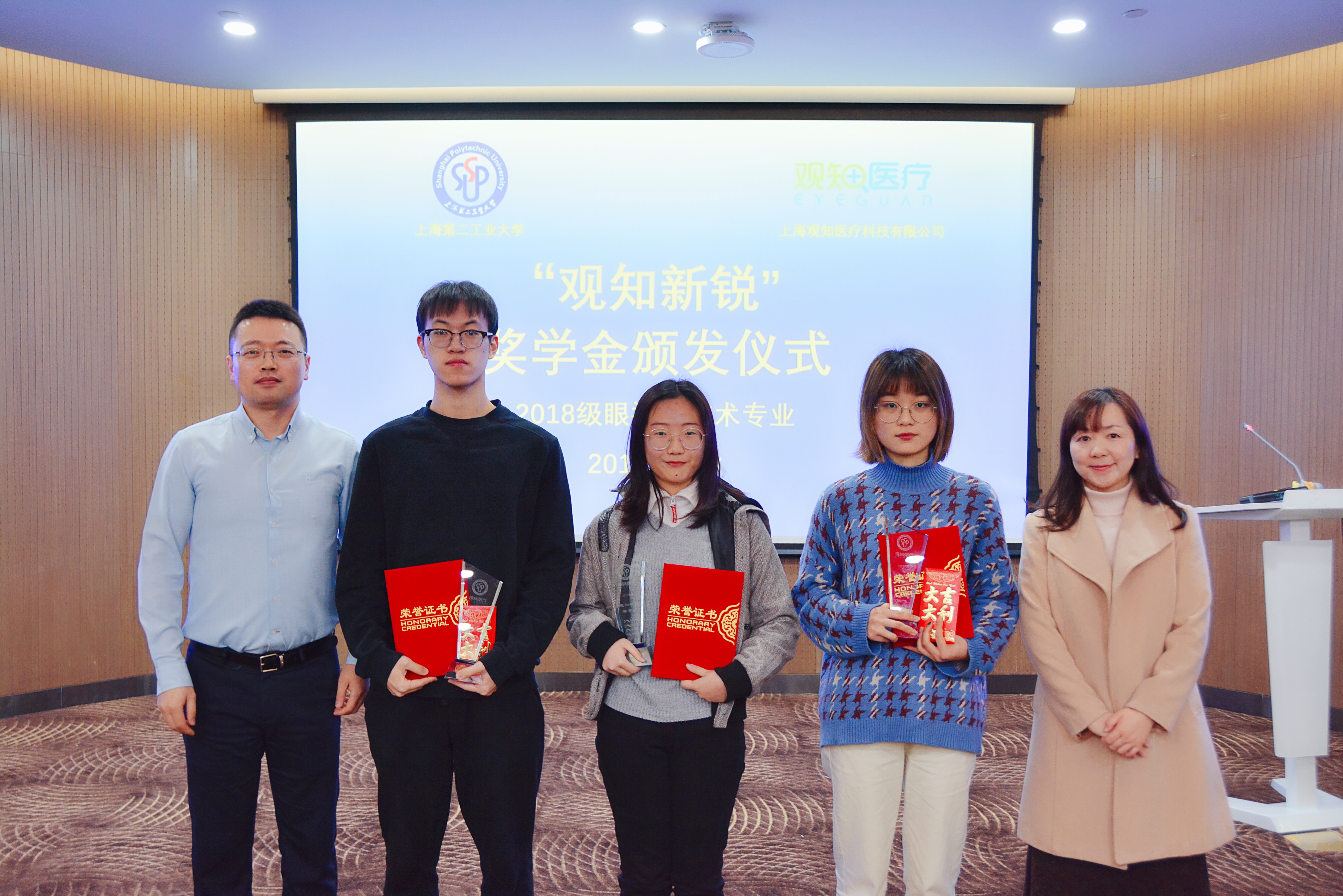 为了激励视光专业学生,推动视光专业发展,共同描绘视光行业蓝图,观知医疗于2018年在我校设立了企业奖学金。同时,为进一步提升视光专业学生专业技能,公司安排一线验配师参与学校理论教学以及特色实训课程,为同学们提供了良好的实习机会。截至目前,我校在观知医疗有限公司就职的学生已有9位。“观知新锐”奖学金面向眼视光专业同学设立,是学院开展校企合作,深度融合的体现。