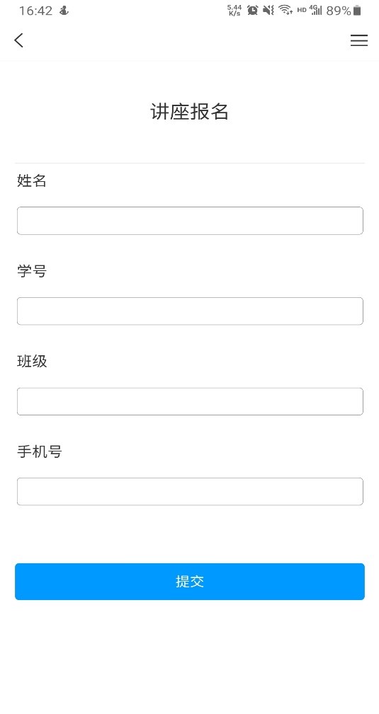 学生进入页面点击“讲座报名”按钮,进入报名表单。(姓名,学号,专业,班级,手机号。务必保证填写内容真实,否则造成的后果自行承担),如下图所示: