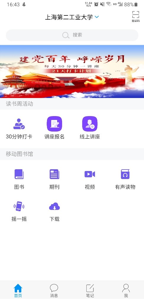 通过手机扫描上图二维码下载学习通,点击右上角输入邀请码:egdtsg,进入单位首页。