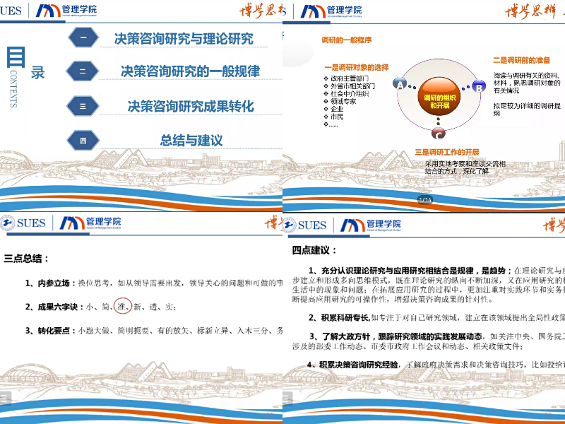 胡斌教授结合个人十余年来开展各类决策咨询类横向项目方面的经验,围绕决策咨询研究与学术研究的异同、决策咨询研究的一般规律、决策咨询研究成果如何转化、如何开拓相关横向项目的渠道等四个方面展开,并通过实际案例分享自己的心得体会。他强调,在报告书写中,研究内容注意“四个要”,标题要凝练、观点要鲜明、语言要简洁、逻辑要清晰。胡斌教授建议教师们逐步建立和形成多项思维模式,将理论研究和应用研究相结合,专注自身学科优势和研究领域,了解大政方针,跟踪研究领域的实践发展动态,积累决策咨询研究经验。