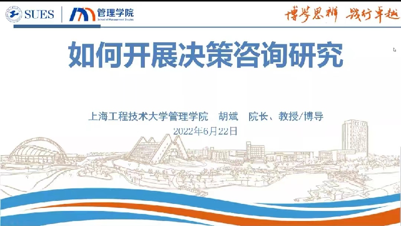 6月22日下午,为充分发挥学校服务地方经济社会发展作用,与时俱进开拓创新做好决策咨询工作,积极促进我校为资政建言服务,科研处邀请上海工程技术大学管理学院院长胡斌教授举办“如何开展决策咨询研究”专题讲座。讲座采取线上方式举行,科研处处长徐海萍主持,各二级单位百余名教师参加。