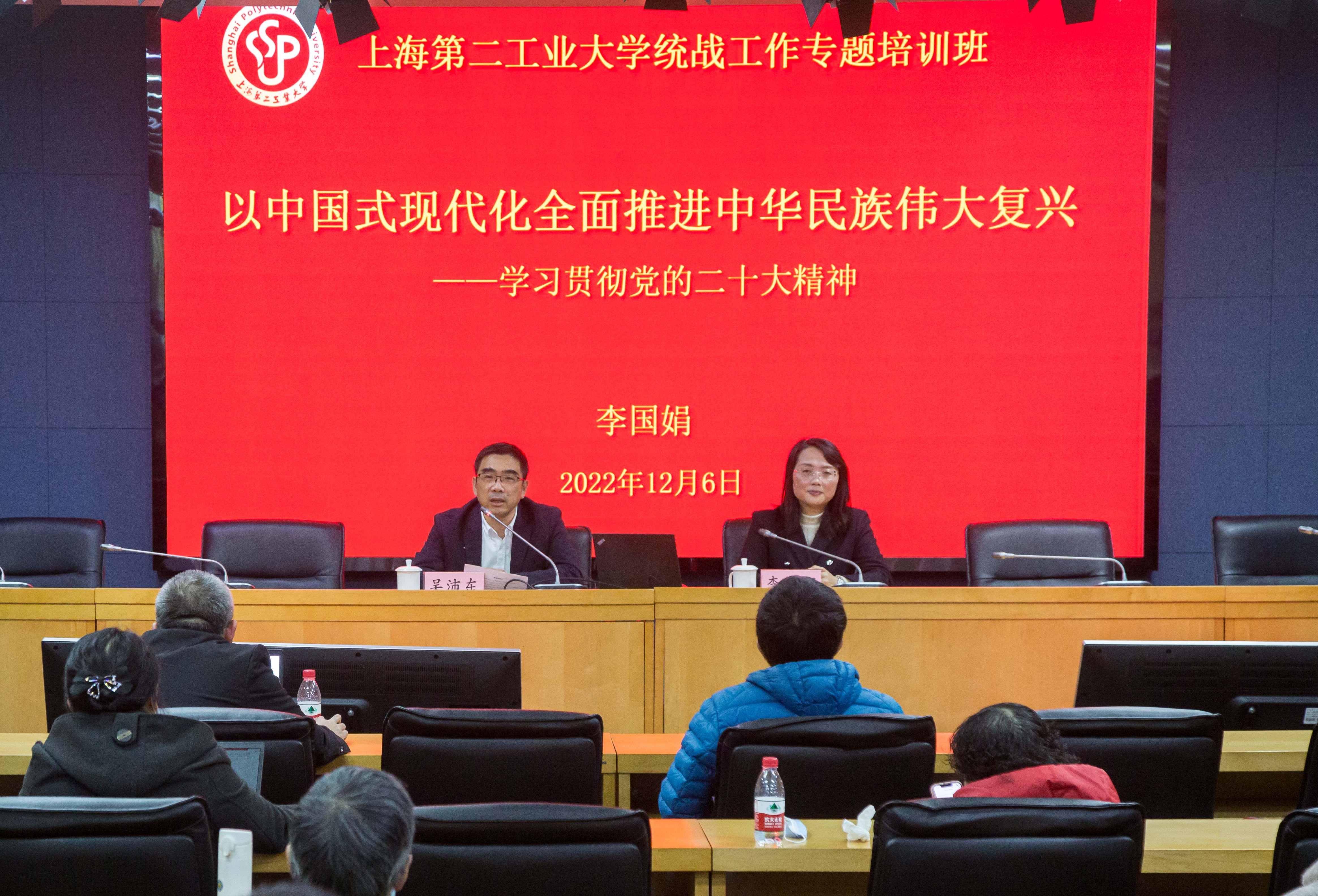 12月6日下午,学校统战工作专题培训班第四期讲座在学术交流中心201会议室举行。上海市学习贯彻党的二十大精神专家宣讲团成员、上海市习近平新时代中国特色社会主义思想研究中心研究员、九三学社上海市委专职副主委李国娟应邀为培训班作专题辅导报告。报告会由校党委副书记吴沛东主持。