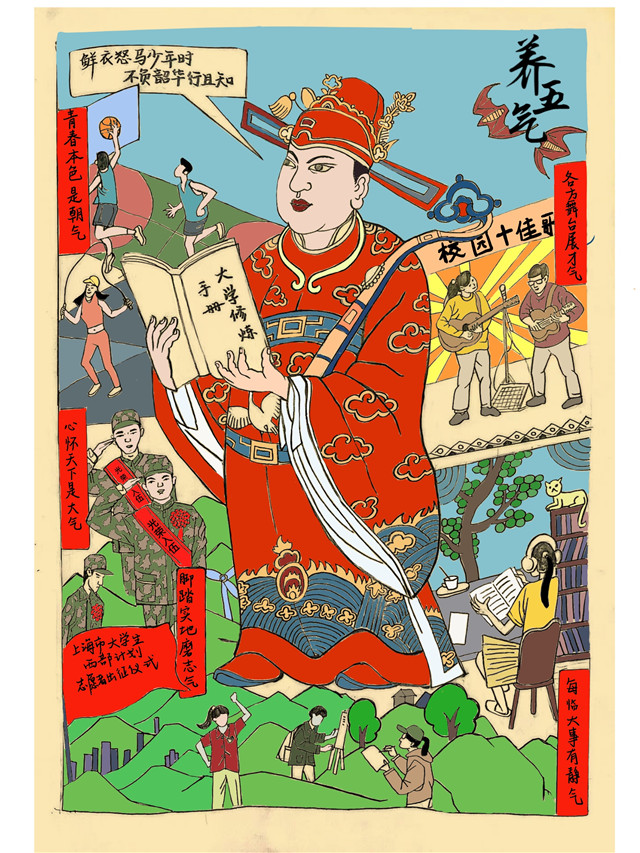而在“状元郎之大学需养五气”非遗年画中,画面也是让人忍俊不禁又若有所思。“状元”在古代科举考试中,是取得殿试第一名的称号。身着红帔、帽插金花的如意状元是学霸的象征。图中,状元郎犹如“新时代考神”,手里拿着“大学修炼手册”,这代表即使天赋异禀仍然需要在新的天地里继续“升级打怪”,在大学“养五气”。