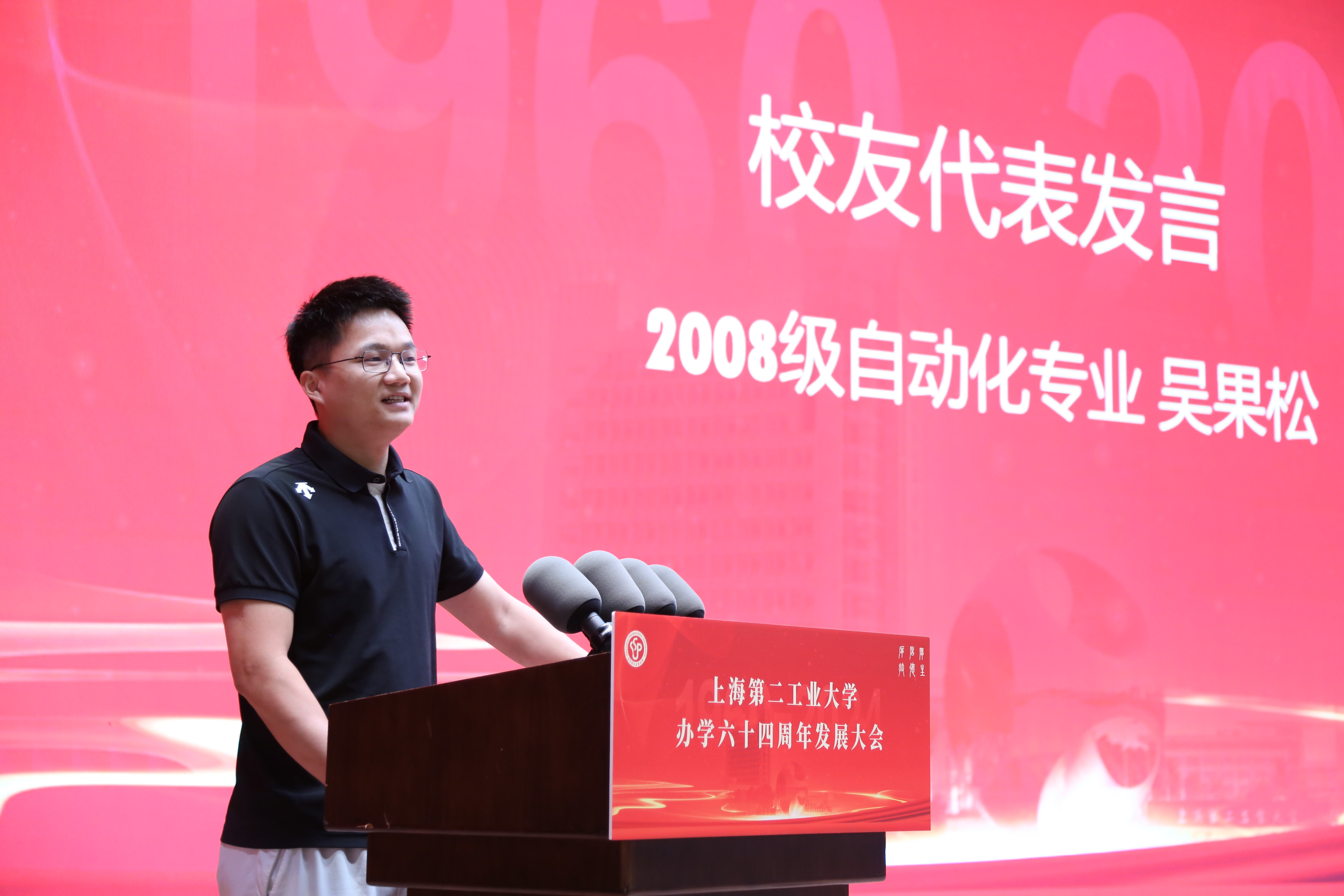 2012届自动化专业校友、现就职于上海繁易信息科技股份有限公司大客户总监的吴果松先生作为校友代表致辞。吴果松重温了在二工大学习和生活的点点滴滴,回顾了自己毕业后的创业发展历程,并感谢母校对自己的培养。
