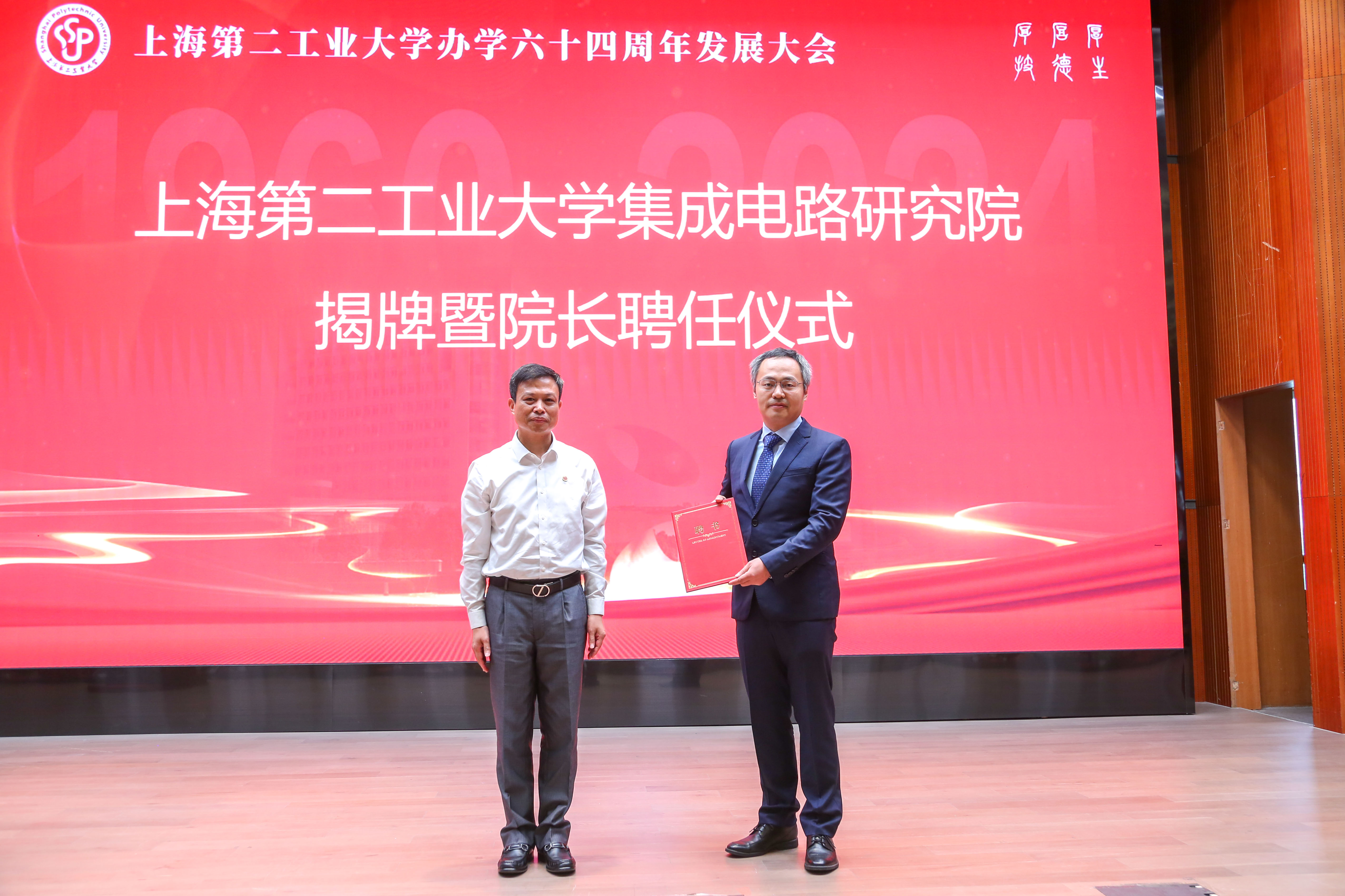 此次发展大会还举行了集成电路研究院揭牌暨院长聘任仪式。华虹集团董事长张素心和校党委书记陆敏共同为集成电路研究院揭牌。校长谢华清为鲍华教授颁发了院长聘书。