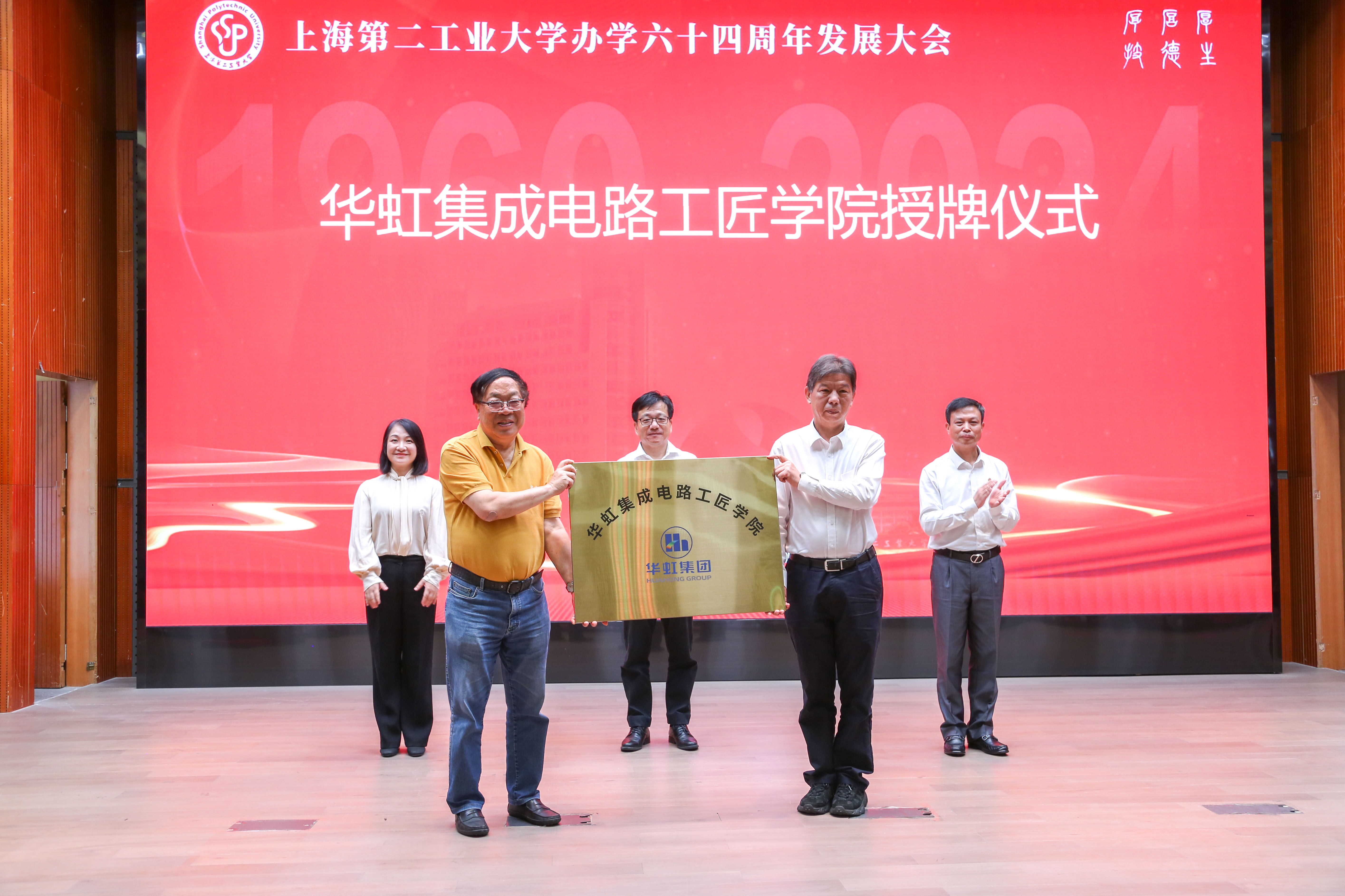 为进一步加强产学研深度融合、传承劳模精神,我校与华虹集团依托上海劳模学院合作共建“华虹集成电路工匠学院。在陆敏书记、谢华清校长与华虹集团党委委员、工会主席、党办主任赵蓉的共同见证下,张素心董事长为包起帆院长授牌。