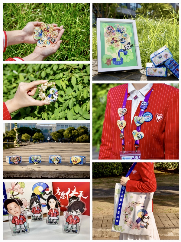 仪式现场还发布了由我校艺术与设计学院吴禹洁、张喆馨、张宸雨、李之兰等多位志愿者共同设计的纪念徽章、定制帆布袋、“小叶子”玩偶等特色文创产品。此次的徽章围绕责任共赢、数字化、新能源与绿色等四个主题进行设计,并融入学校志愿者吉祥物“小工蚁”等元素,象征着二工大“小叶子”们将与本届进博会携手并进。此次文创产品沿用了深受学生喜爱的经典系列产品,包括隐藏任务魔术贴、“小叶子”铭牌以及进博专款眼罩等。现场也为“小叶子”代表授予了第八届进博会志愿者装备及徽章。