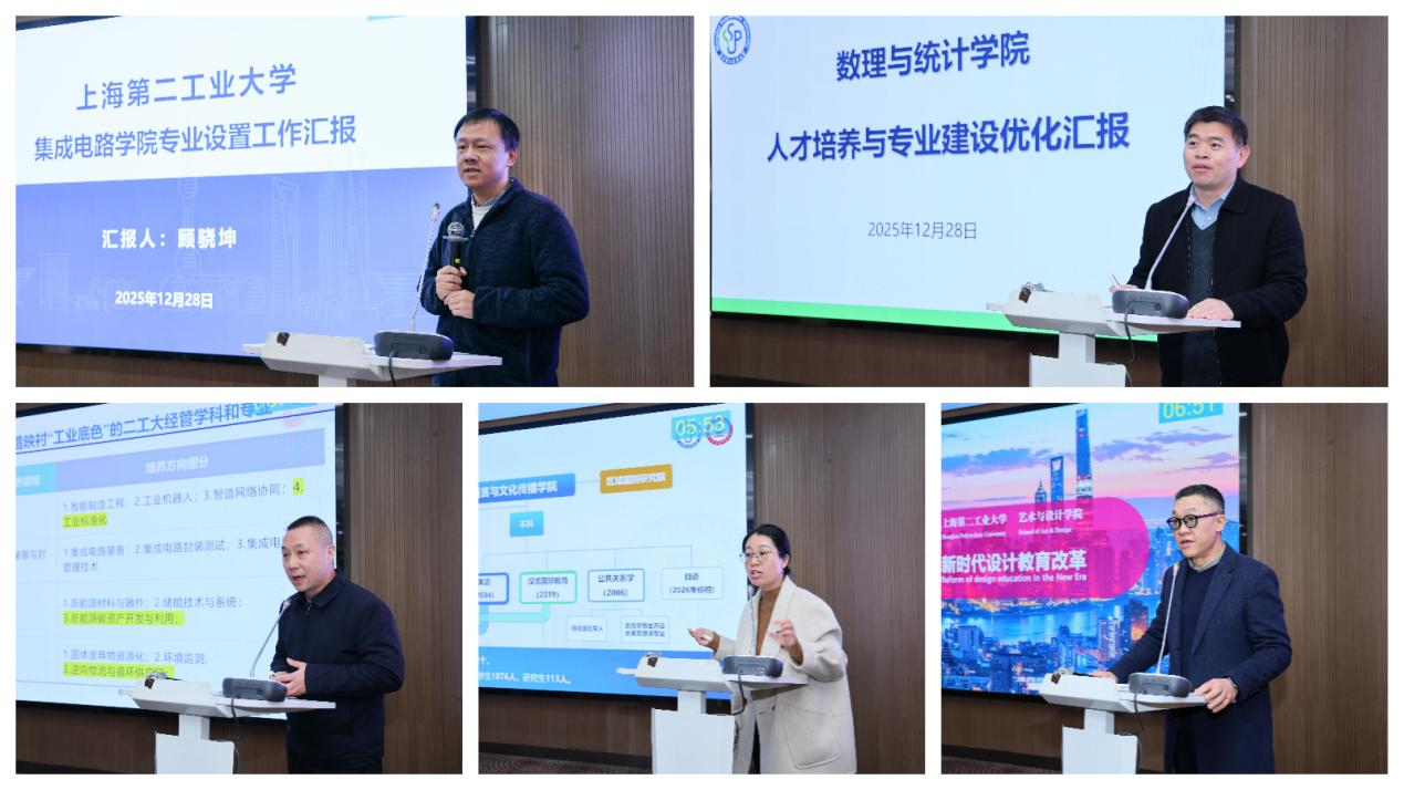 在汇报环节,各学院分别展示了改革举措与成果以及未来规划。智能制造与控制工程学院拟新增机器人工程等3个专业,并试点“工学交替”培养模式;计算机与信息工程学院拟增设人工智能专业及开设了“大模型应用技术”微专业,实现了毕业设计100%源自企业课题;资源与环境工程学院聚焦绿色低碳,构建了“5+1+7+2+2”专业集群;能源与材料学院深化了与龙头企业的专项班合作,构建了“产业链导向培养闭环”;集成电路学院则定位集成电路装备与封测领域,强化实践教学及深化产学研合作,构建梯次培养体系。数理与统计学院服务集成电路等战略产业,重构人才培养模式;经济与管理学院坚持“管工融合”,开设微专业,推进“专业+标准化”融合试点;语言与文化传播学院培养“通世界、懂工业、会传播”的人才;艺术与设计学院推动“产业+设计”教育体系,探索工科与美学的融合。