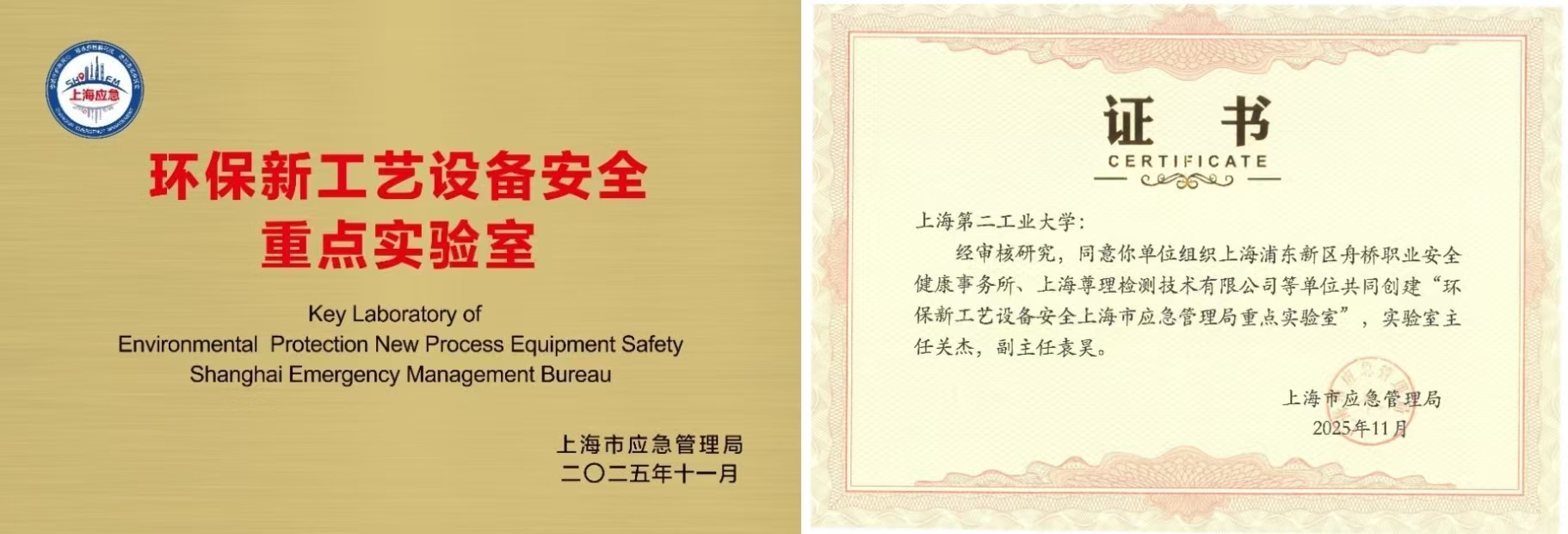 12月26日,第二批上海市应急管理局重点实验室授牌仪式举行。由我校资源与环境工程学院牵头,联合上海浦东新区舟桥职业安全健康事务所、上海尊理检测技术有限公司等共建的“环保新工艺设备安全重点实验室”被正式批准挂牌,成为赋能我校环保与安全交叉领域高质量发展的重要支撑平台。上海市应急管理局党委书记、局长马坚泓为各单位颁发了证书及铭牌。