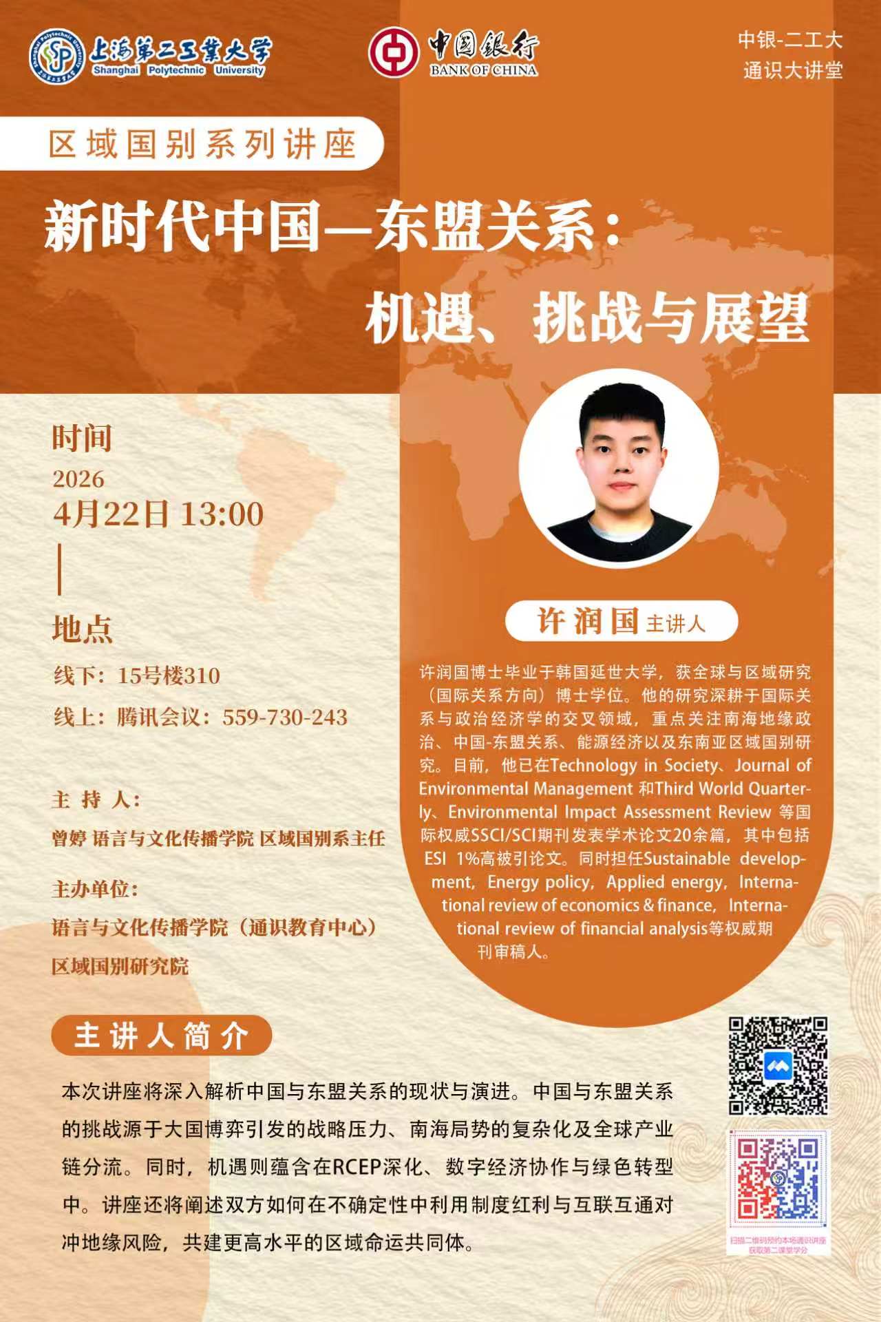 本次讲座将深入解析中国与东盟关系的现状与演进。中国与东盟关系的挑战源于大国博弈引发的战略压力、南海局势的复杂化及全球产业链分流。同时,机遇则蕴含在RCEP深化、数字经济协作与绿色转型中。讲座还将阐述双方如何在不确定性中利用制度红利与互联互通对冲地缘风险,共建更高水平的区域命运共同体。