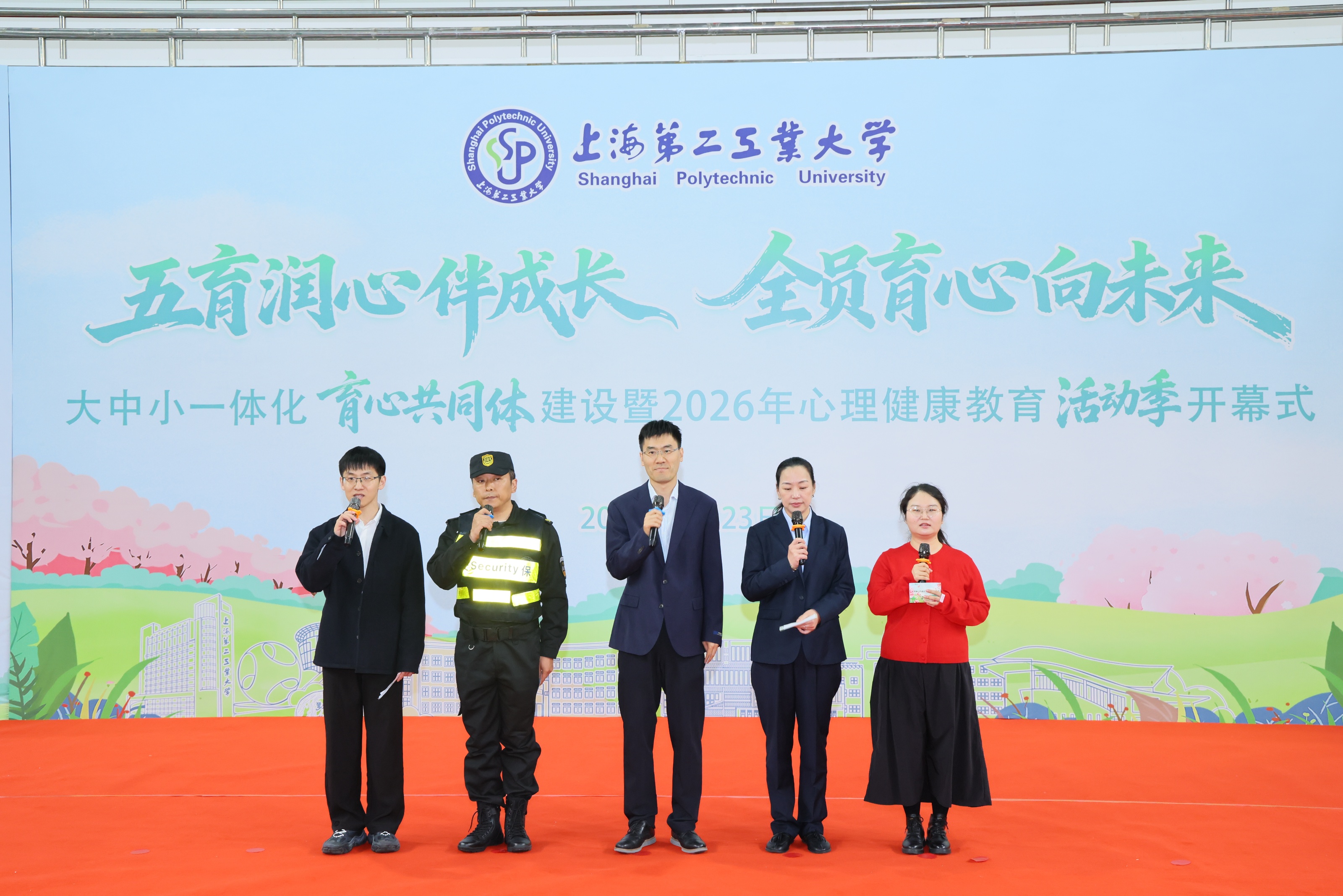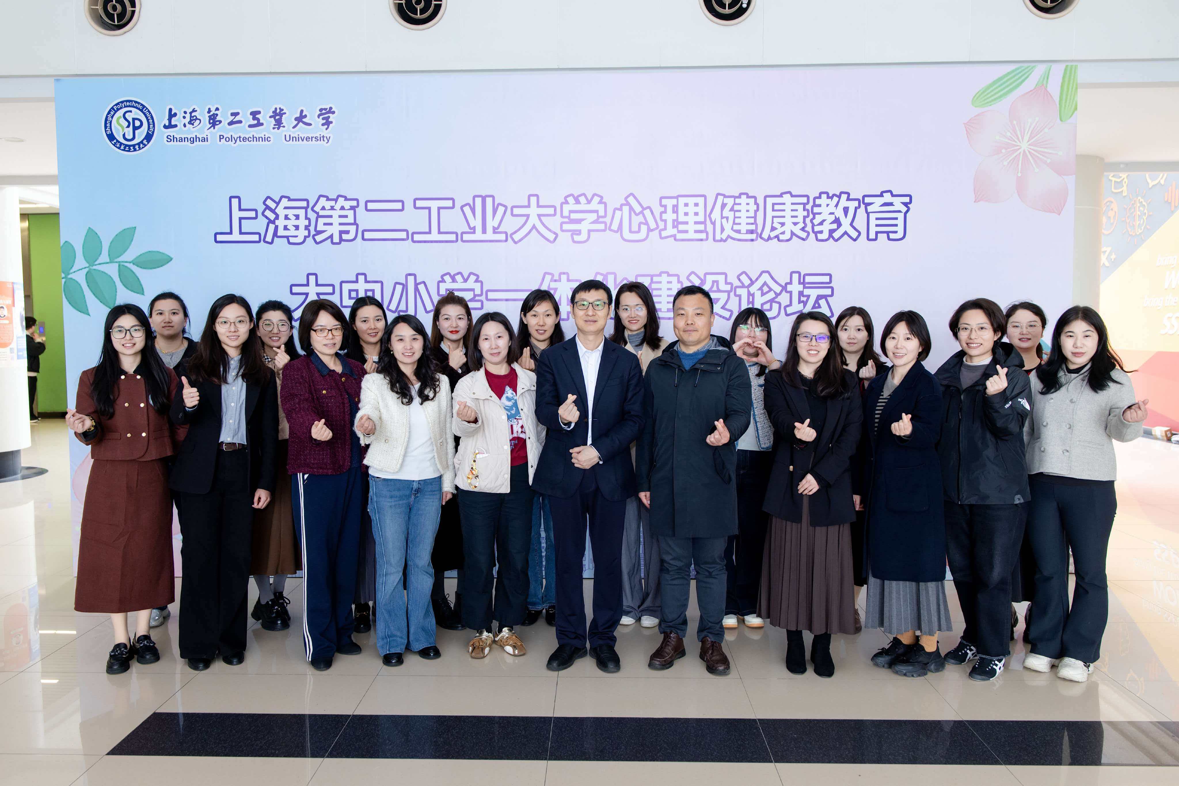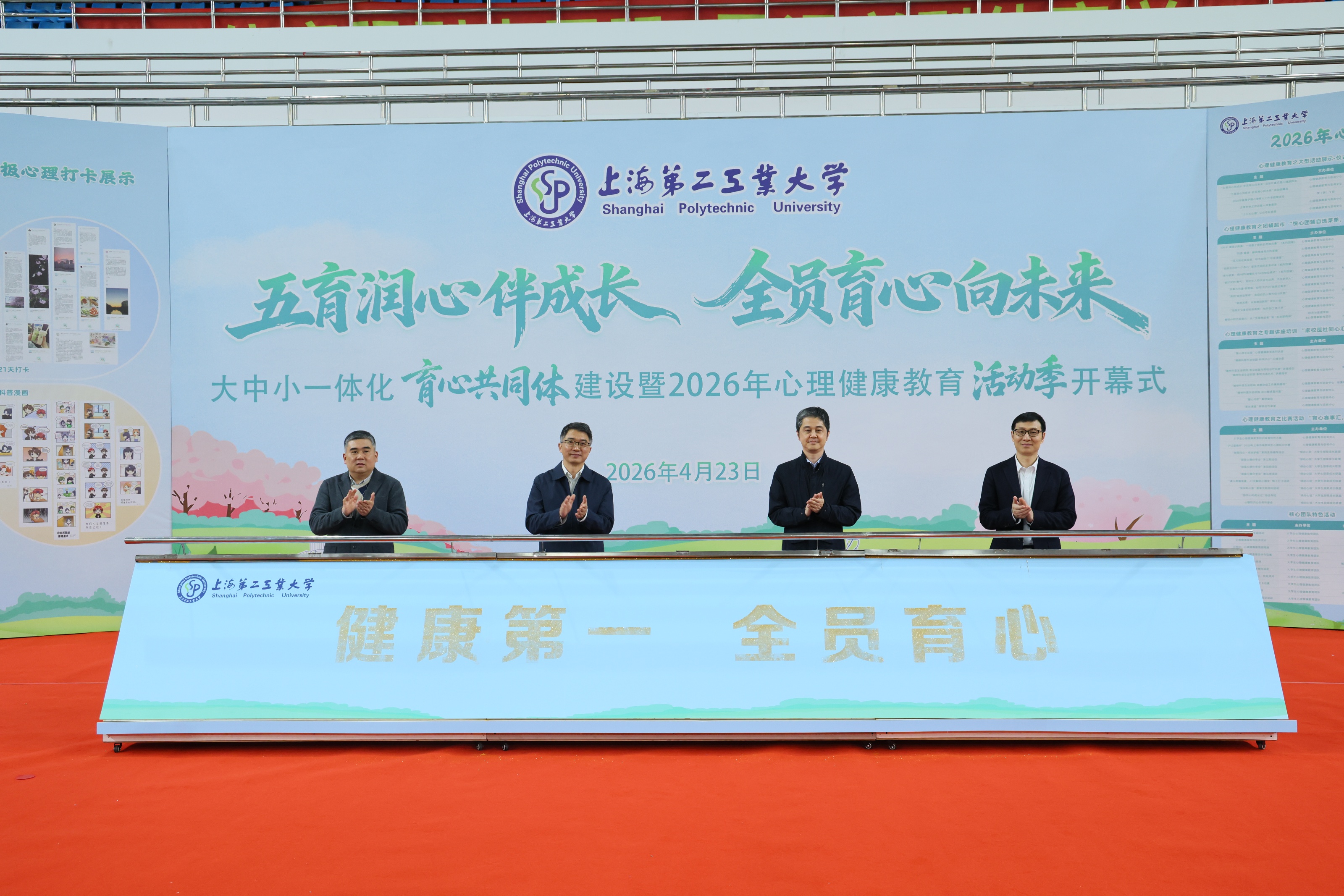 4月23日中午,学校大中小学一体化育心共同体建设暨2026年心理健康活动季开幕式在体育馆内举行。上海市教委德育处、上海市教育科学研究院德育发展研究院、杨浦区精神卫生中心、浦东新区精神卫生中心、上海市工业技术学校、上海市经济管理学校、上海市第二轻工业学校、附属龚路中学等单位领导,学校相关职能部门负责人、各学院分管学院副书记、教师代表、全体辅导员、学生代表等齐聚现场,共同参加本次活动。
