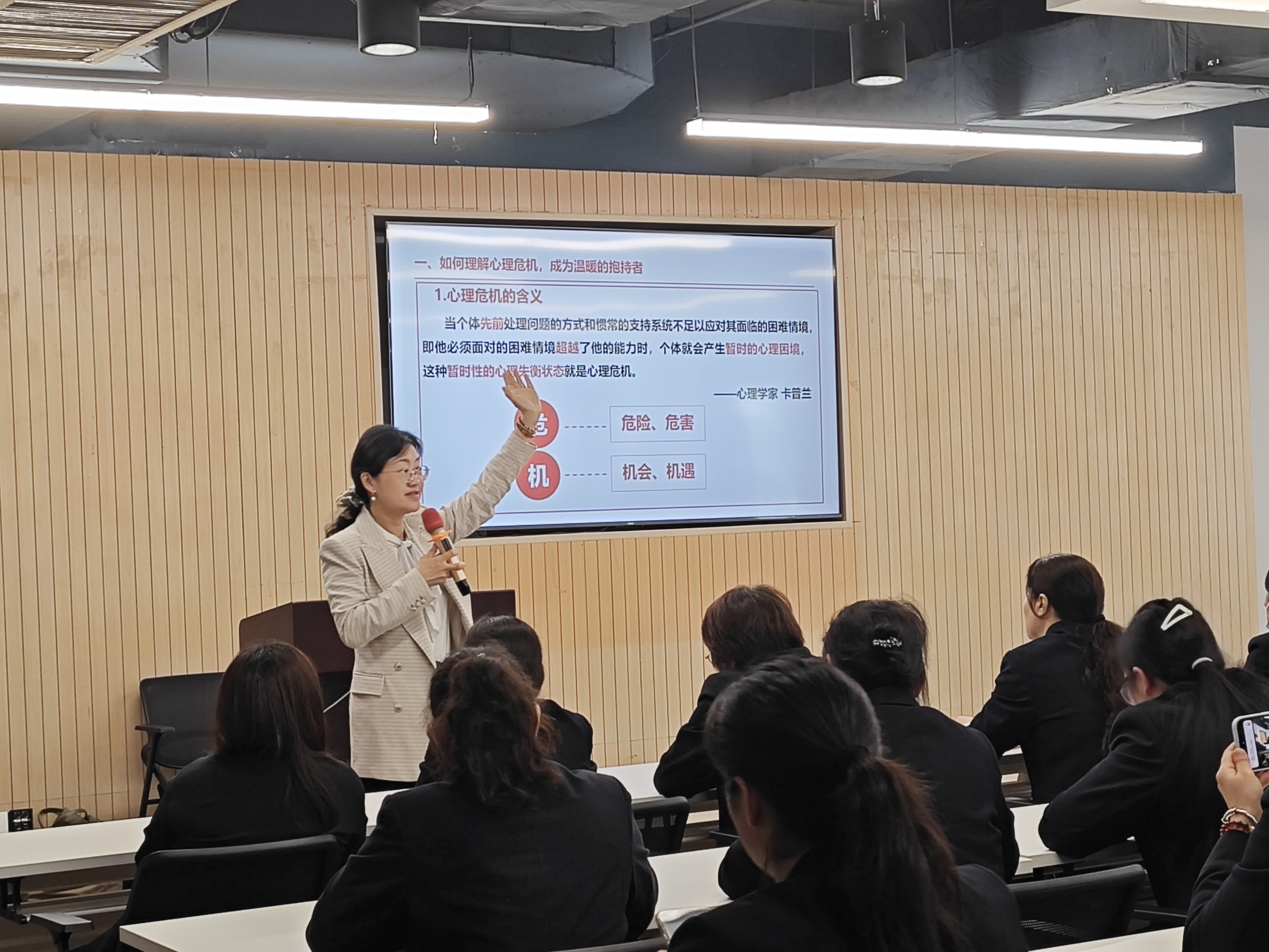 在活动前期,为深入贯彻教育部“健康第一”教育理念,全面落实“全员育心”工作要求,推动全员育心协同格局的构建,特邀心理健康教育专家为后勤宿管与安保人员开展大学生心理健康工作专题培训。培训聚焦心理危机识别与初步干预,内容涵盖“什么是心理危机”“如何识别心理危机”“QPR危机干预技术”等核心模块,结合校园工作实际,帮助后勤与保卫人员在日常巡查和管理服务中做到早发现、早关注。